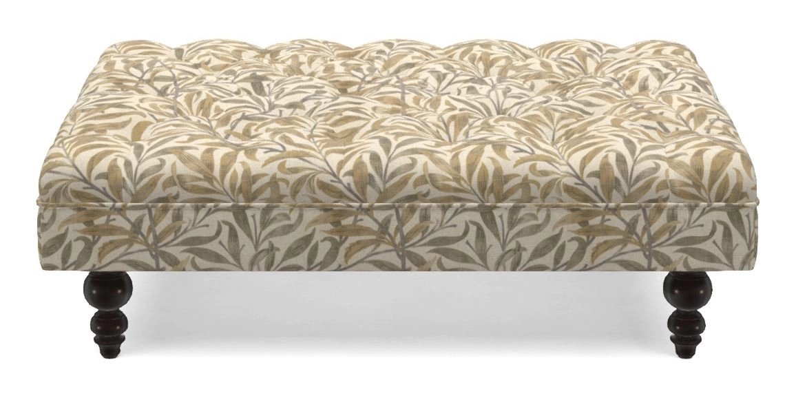 A traditionally styled, large, low rectangular footstool featuring classic buttoning and solid hardwood turned feet.