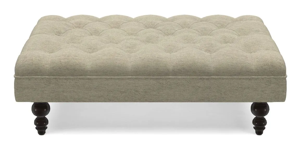 A traditionally styled, large, low rectangular footstool featuring classic buttoning and solid hardwood turned feet.