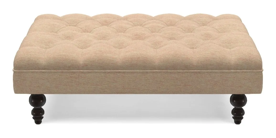 A traditionally styled, large, low rectangular footstool featuring classic buttoning and solid hardwood turned feet.