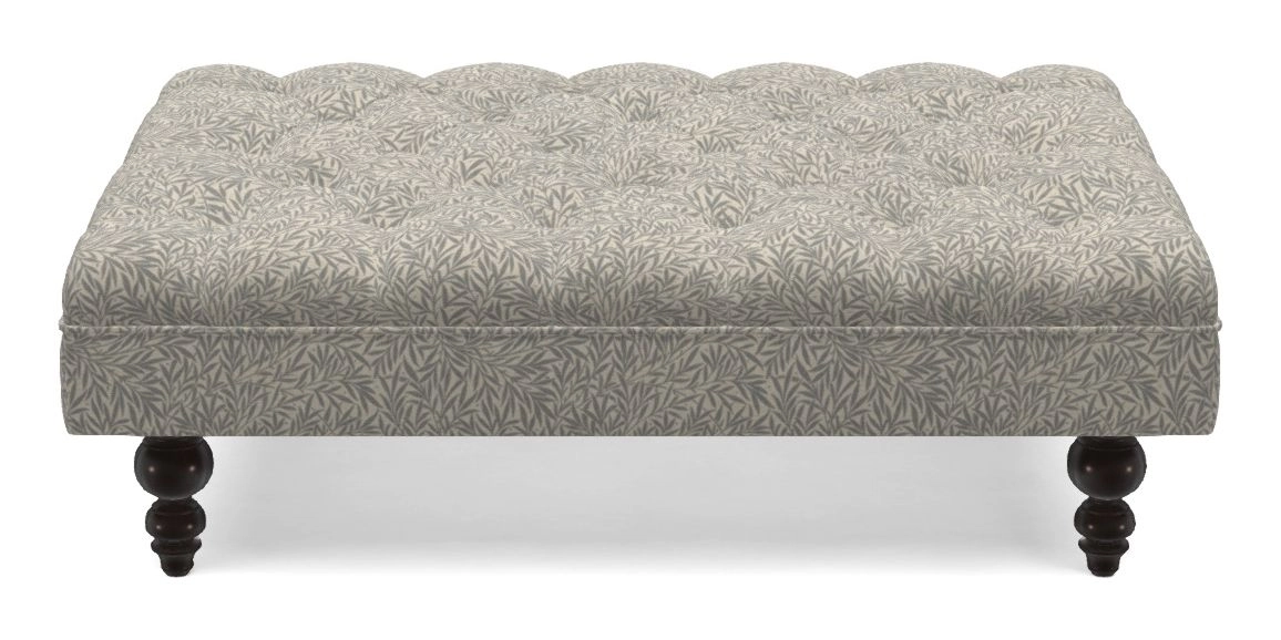 A traditionally styled, large, low rectangular footstool featuring classic buttoning and solid hardwood turned feet.