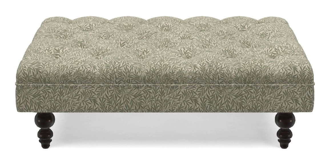 A traditionally styled, large, low rectangular footstool featuring classic buttoning and solid hardwood turned feet.