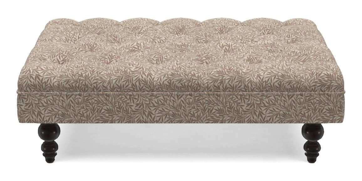 A traditionally styled, large, low rectangular footstool featuring classic buttoning and solid hardwood turned feet.