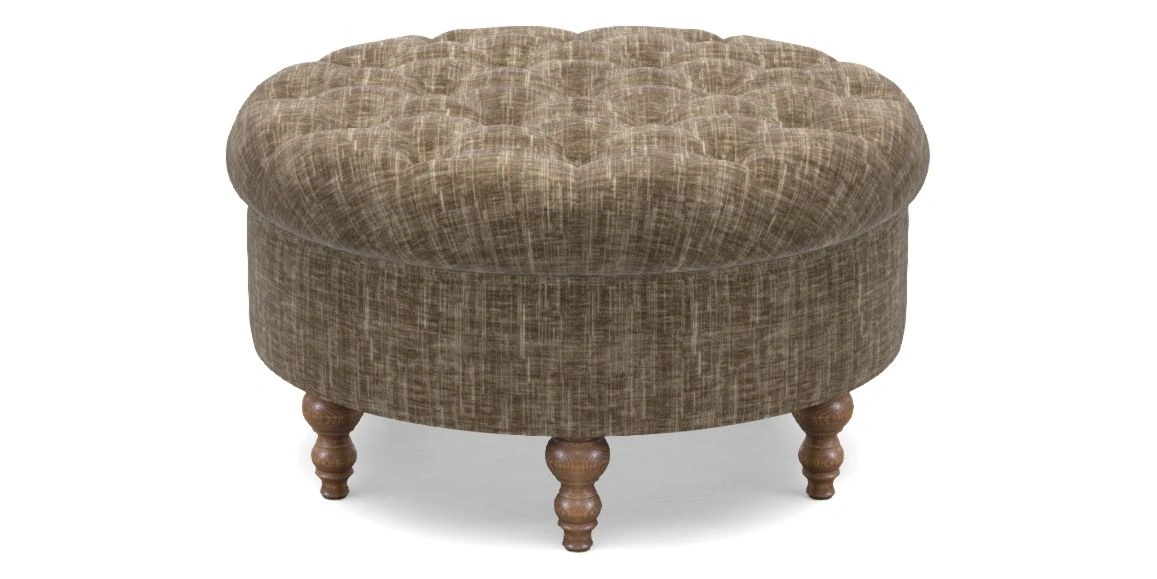 A round, deep-buttoned footstool design that provides a comfortable spot for resting feet or serving a tray of tea. A stylish and practical addition to any space.