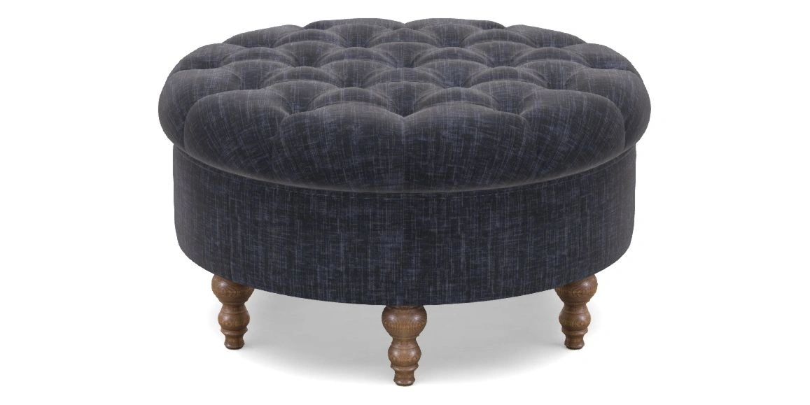 A round, deep-buttoned footstool design that provides a comfortable spot for resting feet or serving a tray of tea. A stylish and practical addition to any space.