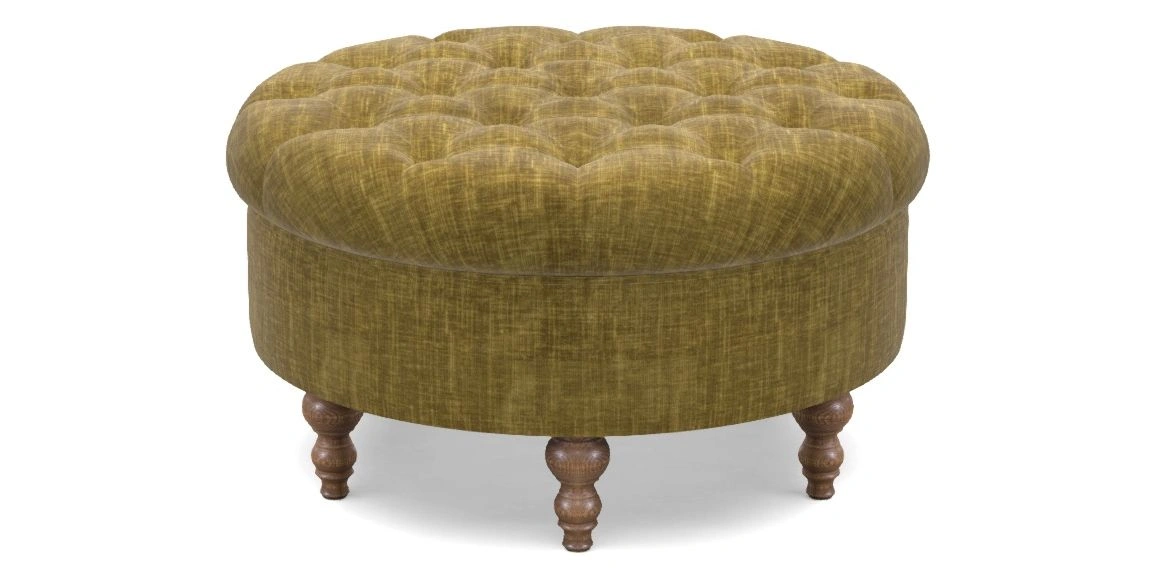 A round, deep-buttoned footstool design that provides a comfortable spot for resting feet or serving a tray of tea. A stylish and practical addition to any space.