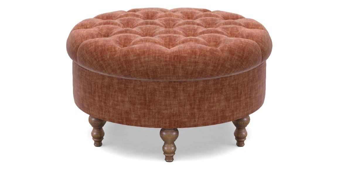 A round, deep-buttoned footstool design that provides a comfortable spot for resting feet or serving a tray of tea. A stylish and practical addition to any space.