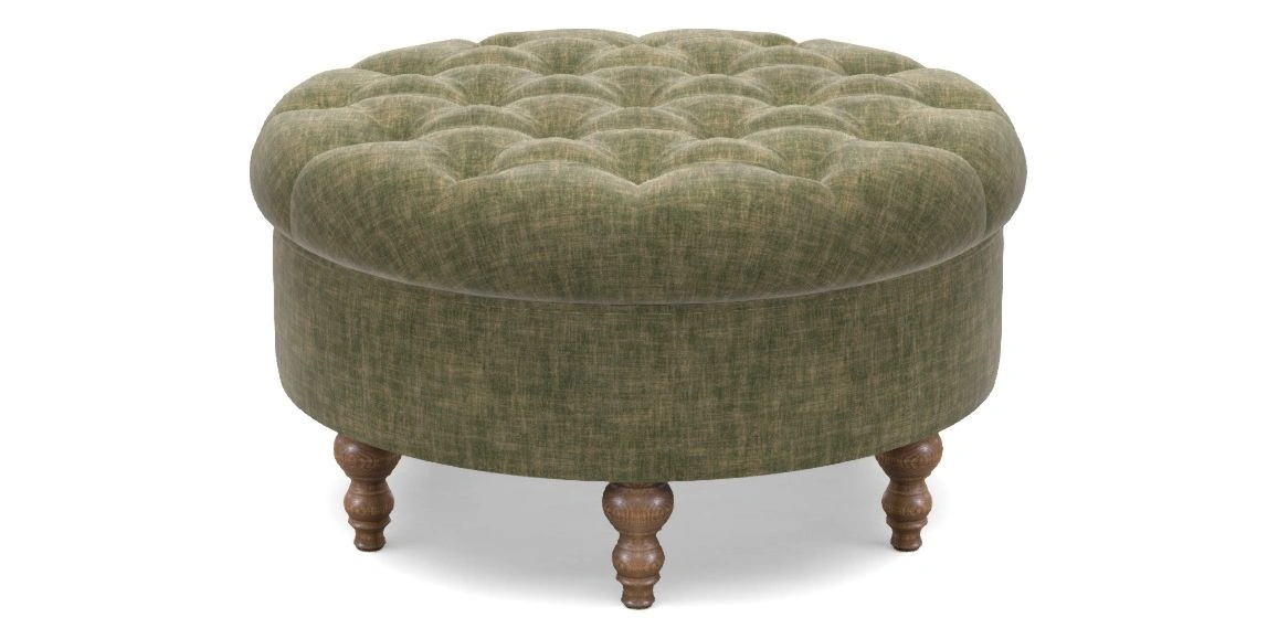 A round, deep-buttoned footstool design that provides a comfortable spot for resting feet or serving a tray of tea. A stylish and practical addition to any space.