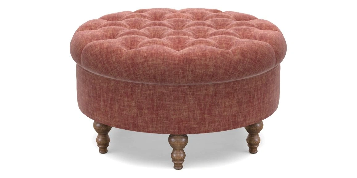 A round, deep-buttoned footstool design that provides a comfortable spot for resting feet or serving a tray of tea. A stylish and practical addition to any space.