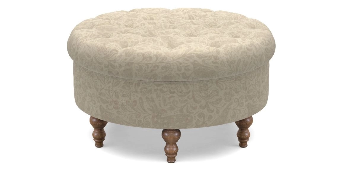 A round, deep-buttoned footstool design that provides a comfortable spot for resting feet or serving a tray of tea. A stylish and practical addition to any space.