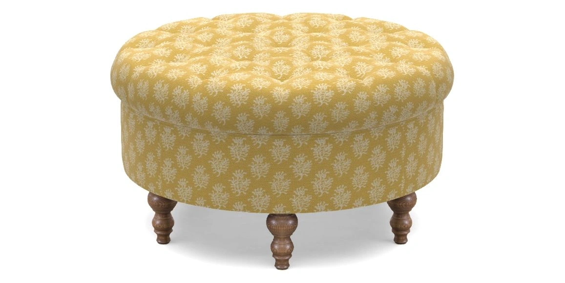 A round, deep-buttoned footstool design that provides a comfortable spot for resting feet or serving a tray of tea. A stylish and practical addition to any space.