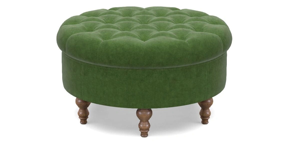 A round, deep-buttoned footstool design that provides a comfortable spot for resting feet or serving a tray of tea. A stylish and practical addition to any space.