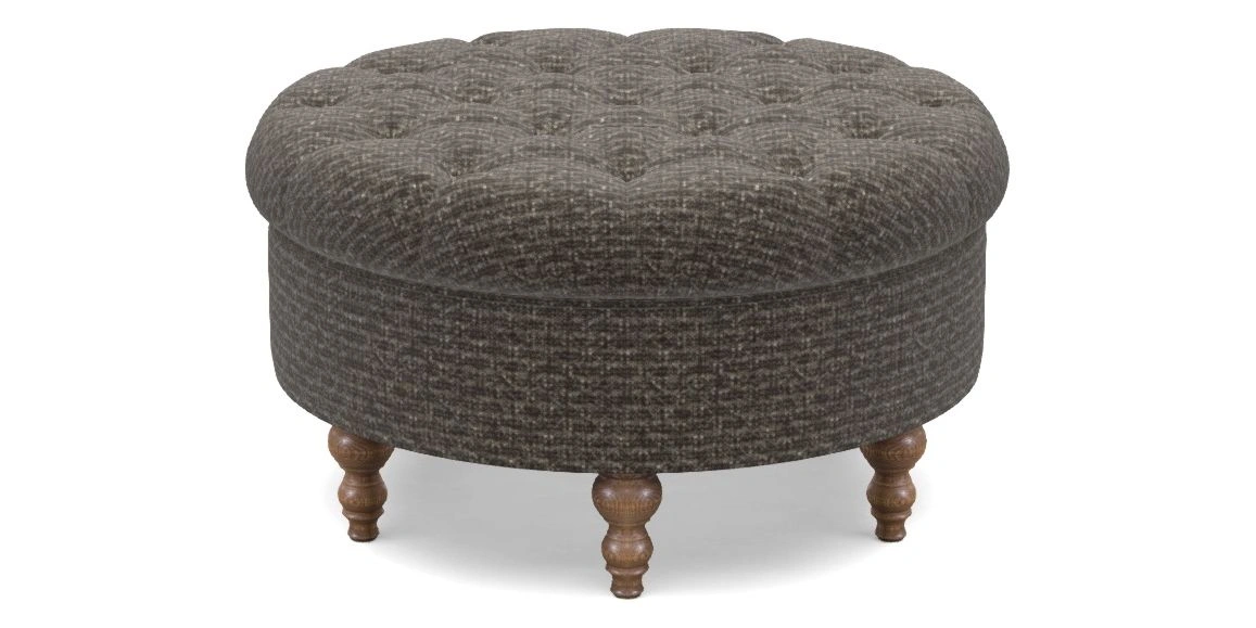 A round, deep-buttoned footstool design that provides a comfortable spot for resting feet or serving a tray of tea. A stylish and practical addition to any space.