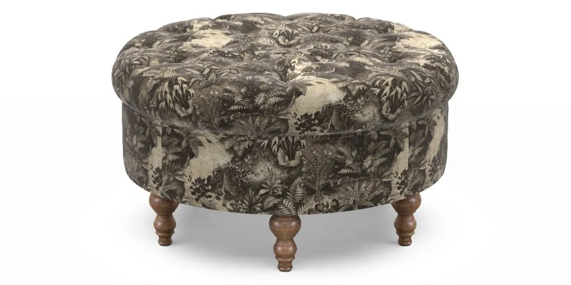 A round, deep-buttoned footstool design that provides a comfortable spot for resting feet or serving a tray of tea. A stylish and practical addition to any space.