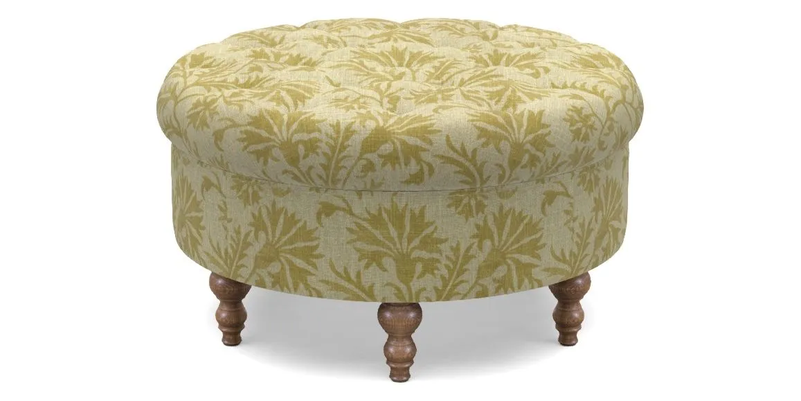 A round, deep-buttoned footstool design that provides a comfortable spot for resting feet or serving a tray of tea. A stylish and practical addition to any space.