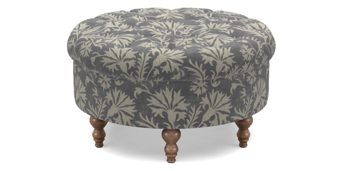 A round, deep-buttoned footstool design that provides a comfortable spot for resting feet or serving a tray of tea. A stylish and practical addition to any space.
