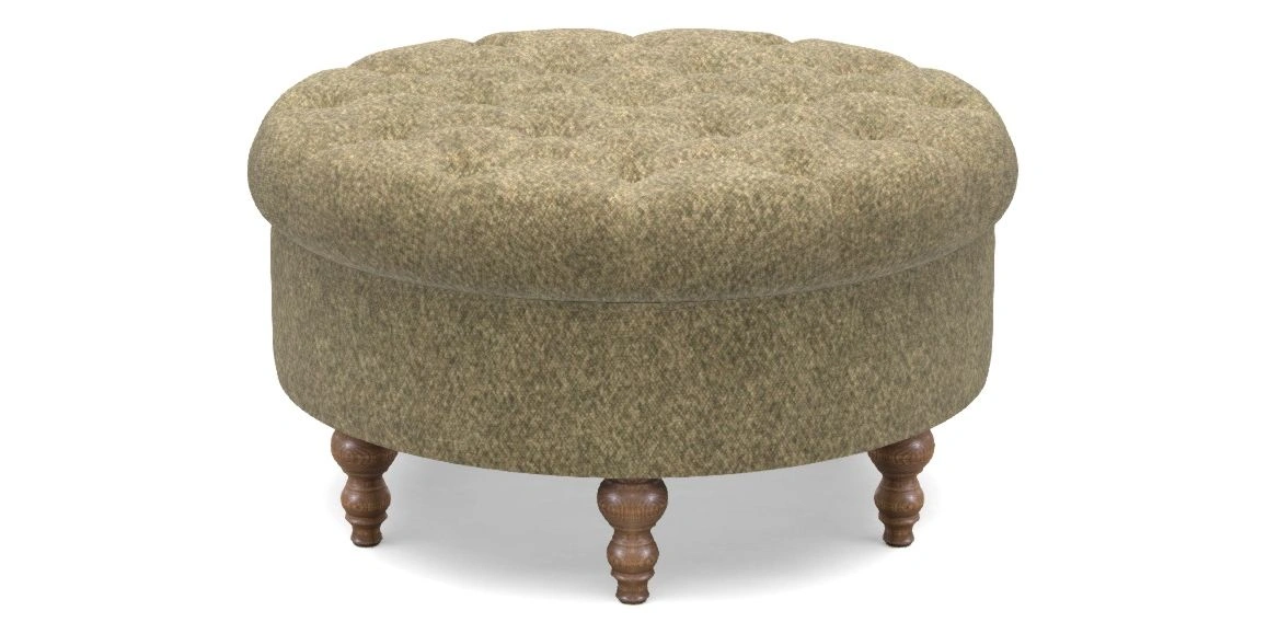 A round, deep-buttoned footstool design that provides a comfortable spot for resting feet or serving a tray of tea. A stylish and practical addition to any space.