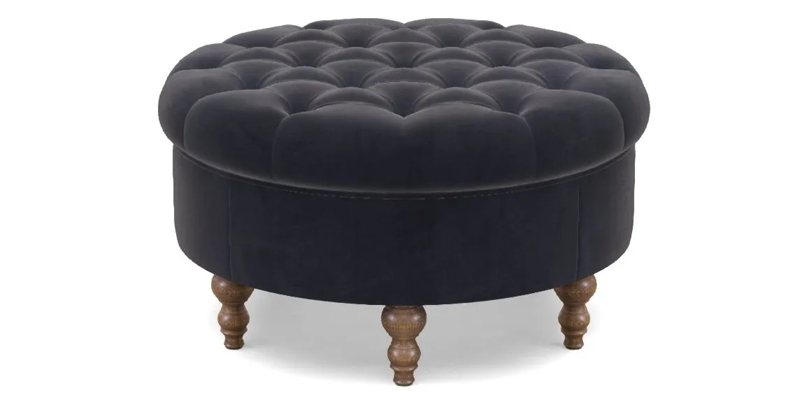 A round, deep-buttoned footstool design that provides a comfortable spot for resting feet or serving a tray of tea. A stylish and practical addition to any space.