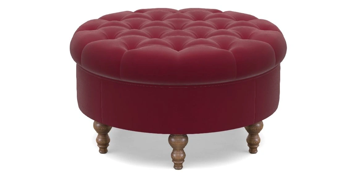 A round, deep-buttoned footstool design that provides a comfortable spot for resting feet or serving a tray of tea. A stylish and practical addition to any space.