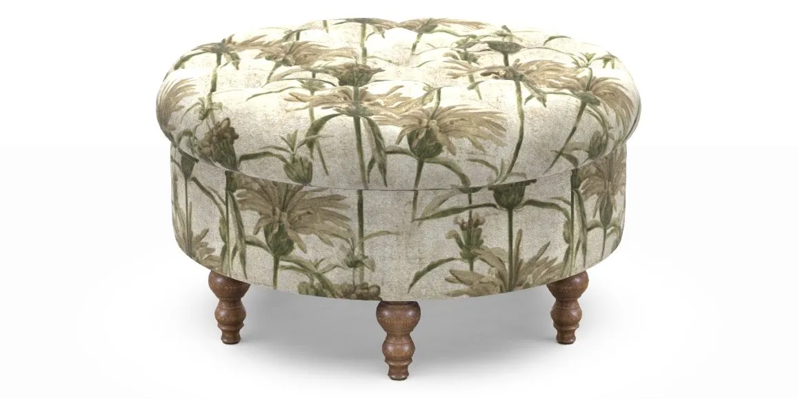 A round, deep-buttoned footstool design that provides a comfortable spot for resting feet or serving a tray of tea. A stylish and practical addition to any space.