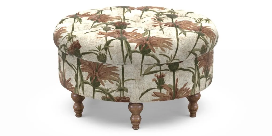 A round, deep-buttoned footstool design that provides a comfortable spot for resting feet or serving a tray of tea. A stylish and practical addition to any space.