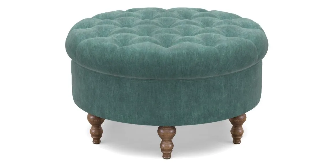 A round, deep-buttoned footstool design that provides a comfortable spot for resting feet or serving a tray of tea. A stylish and practical addition to any space.