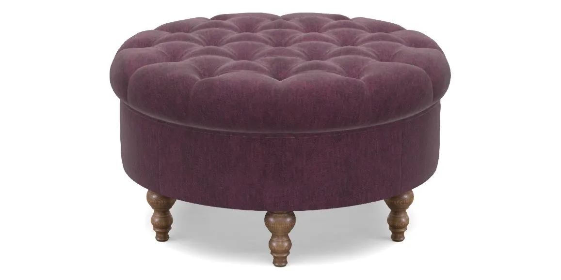 A round, deep-buttoned footstool design that provides a comfortable spot for resting feet or serving a tray of tea. A stylish and practical addition to any space.