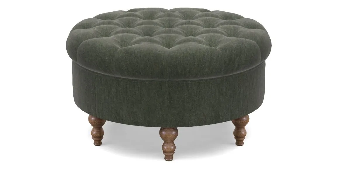 A round, deep-buttoned footstool design that provides a comfortable spot for resting feet or serving a tray of tea. A stylish and practical addition to any space.