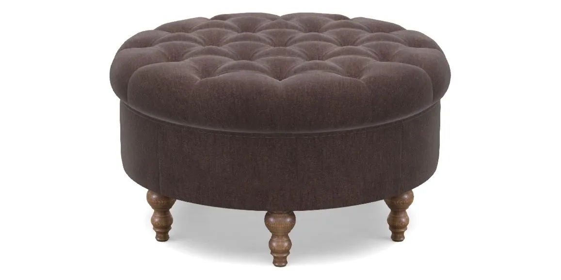 A round, deep-buttoned footstool design that provides a comfortable spot for resting feet or serving a tray of tea. A stylish and practical addition to any space.