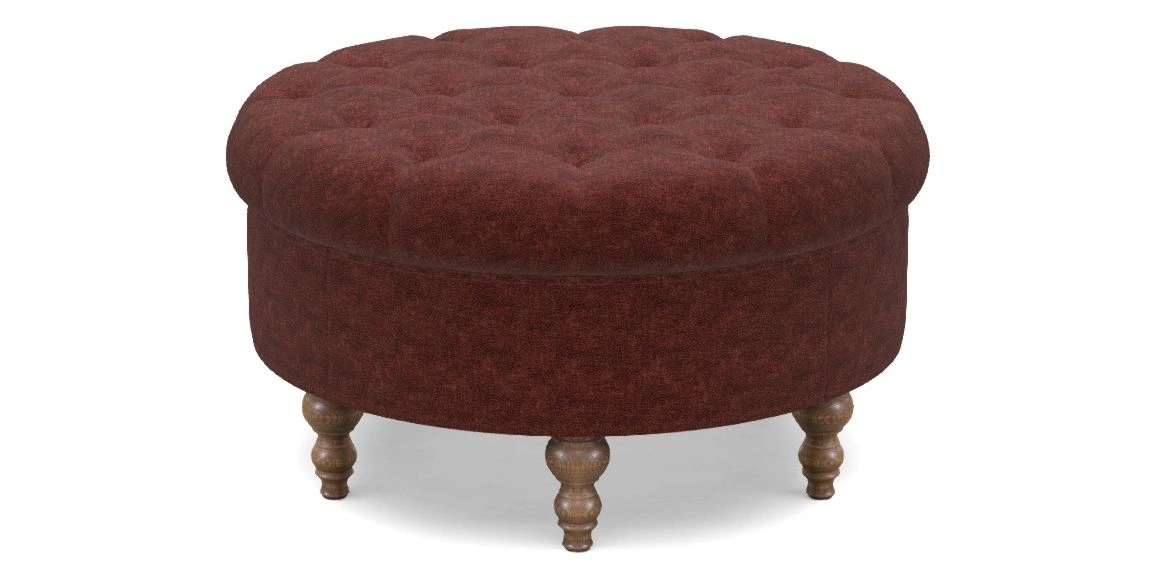 A round, deep-buttoned footstool design that provides a comfortable spot for resting feet or serving a tray of tea. A stylish and practical addition to any space.