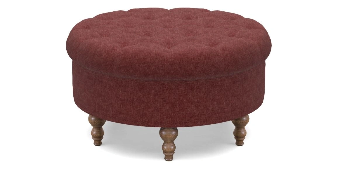 A round, deep-buttoned footstool design that provides a comfortable spot for resting feet or serving a tray of tea. A stylish and practical addition to any space.