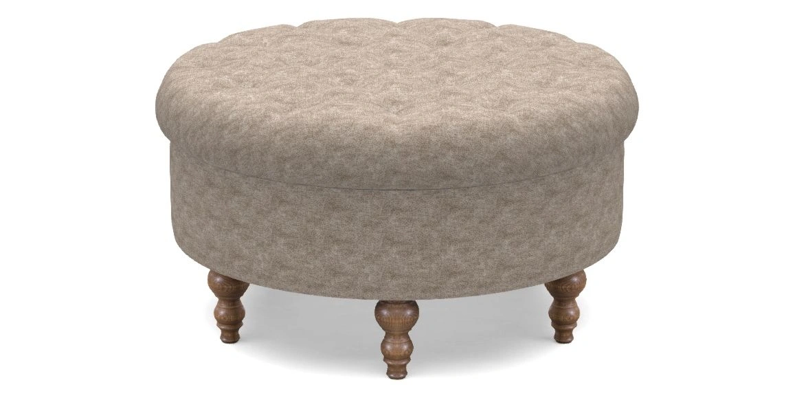 A round, deep-buttoned footstool design that provides a comfortable spot for resting feet or serving a tray of tea. A stylish and practical addition to any space.
