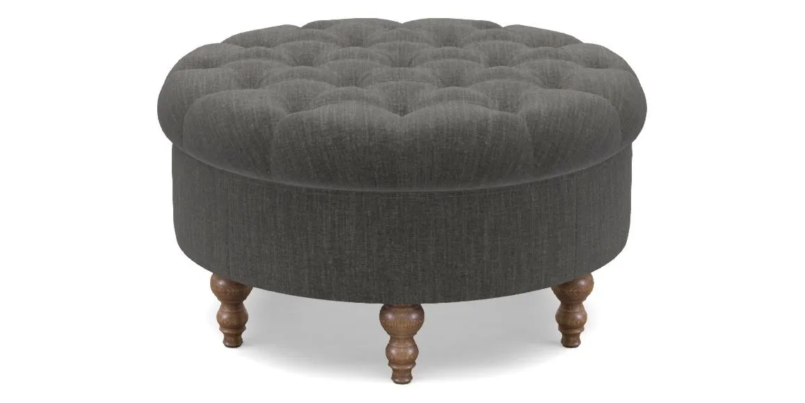 A round, deep-buttoned footstool design that provides a comfortable spot for resting feet or serving a tray of tea. A stylish and practical addition to any space.