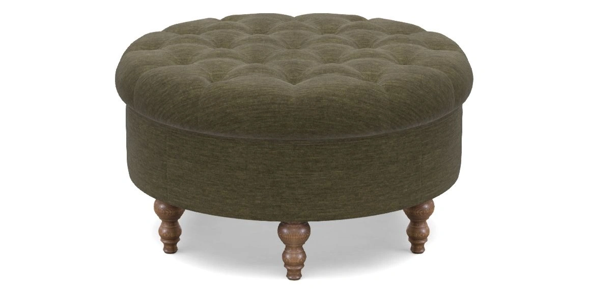 A round, deep-buttoned footstool design that provides a comfortable spot for resting feet or serving a tray of tea. A stylish and practical addition to any space.