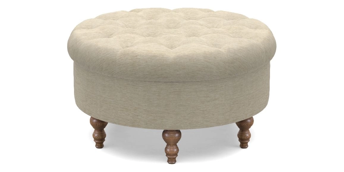 A round, deep-buttoned footstool design that provides a comfortable spot for resting feet or serving a tray of tea. A stylish and practical addition to any space.