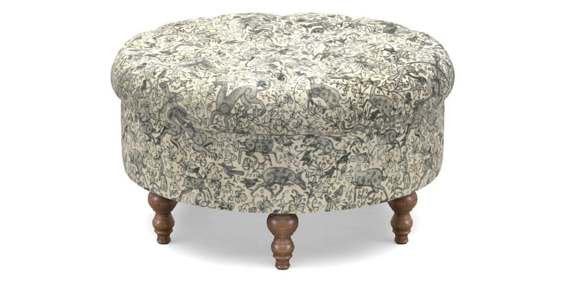 A round, deep-buttoned footstool design that provides a comfortable spot for resting feet or serving a tray of tea. A stylish and practical addition to any space.