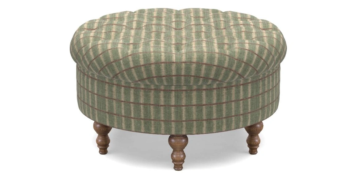 A round, deep-buttoned footstool design that provides a comfortable spot for resting feet or serving a tray of tea. A stylish and practical addition to any space.