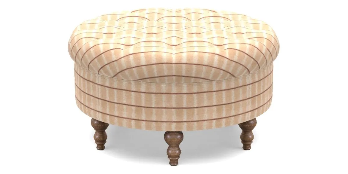 A round, deep-buttoned footstool design that provides a comfortable spot for resting feet or serving a tray of tea. A stylish and practical addition to any space.