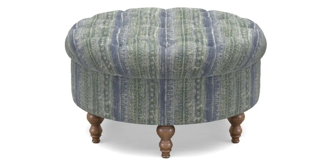 A round, deep-buttoned footstool design that provides a comfortable spot for resting feet or serving a tray of tea. A stylish and practical addition to any space.