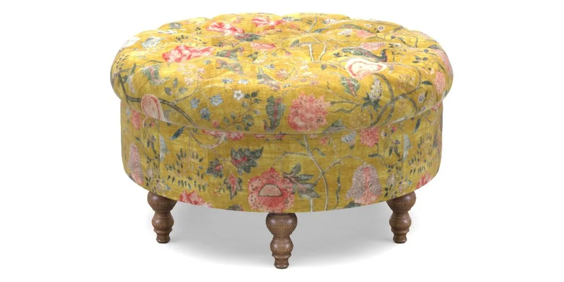 A round, deep-buttoned footstool design that provides a comfortable spot for resting feet or serving a tray of tea. A stylish and practical addition to any space.