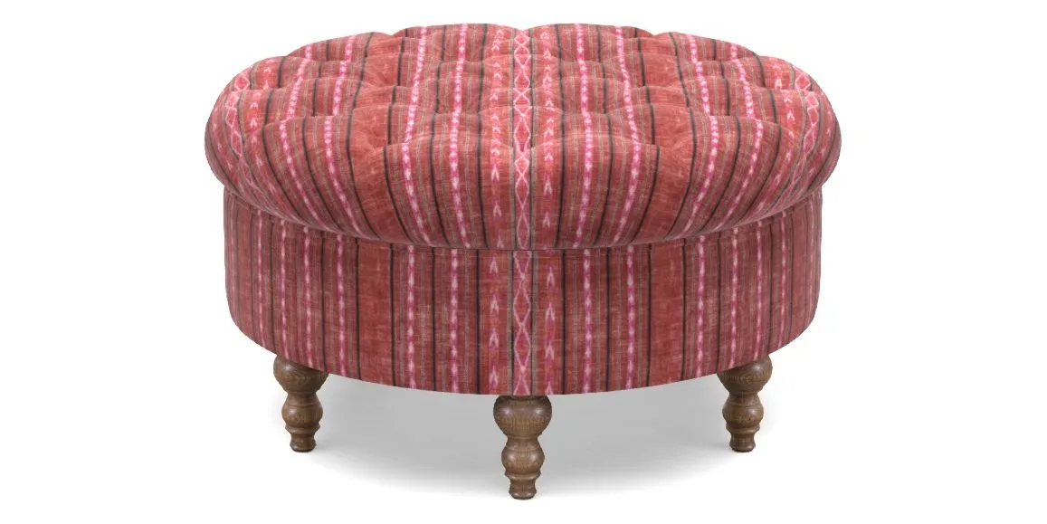 A round, deep-buttoned footstool design that provides a comfortable spot for resting feet or serving a tray of tea. A stylish and practical addition to any space.