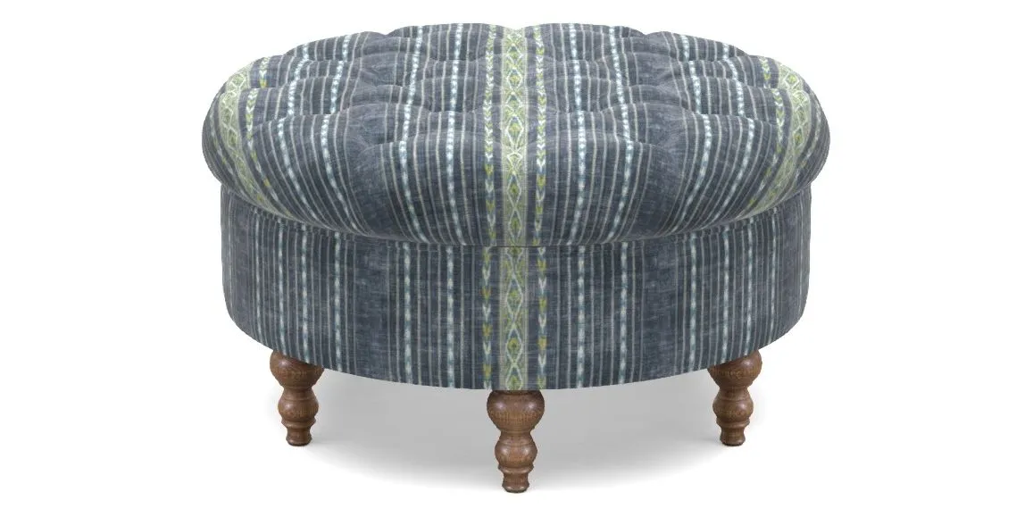 A round, deep-buttoned footstool design that provides a comfortable spot for resting feet or serving a tray of tea. A stylish and practical addition to any space.