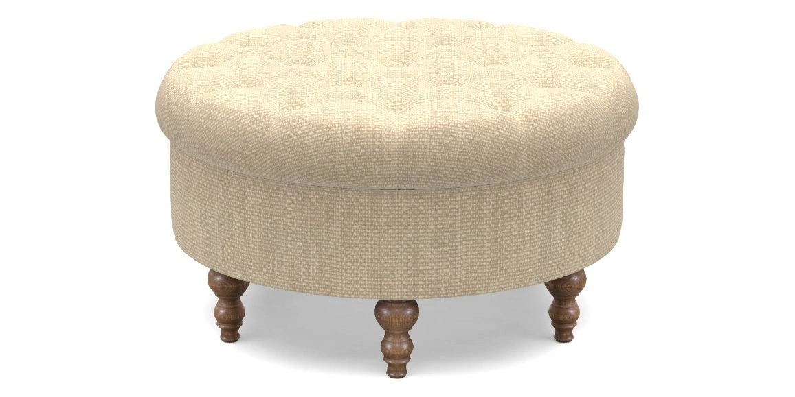 A round, deep-buttoned footstool design that provides a comfortable spot for resting feet or serving a tray of tea. A stylish and practical addition to any space.