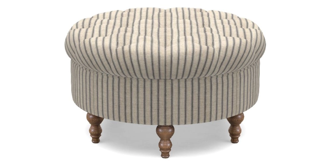 A round, deep-buttoned footstool design that provides a comfortable spot for resting feet or serving a tray of tea. A stylish and practical addition to any space.