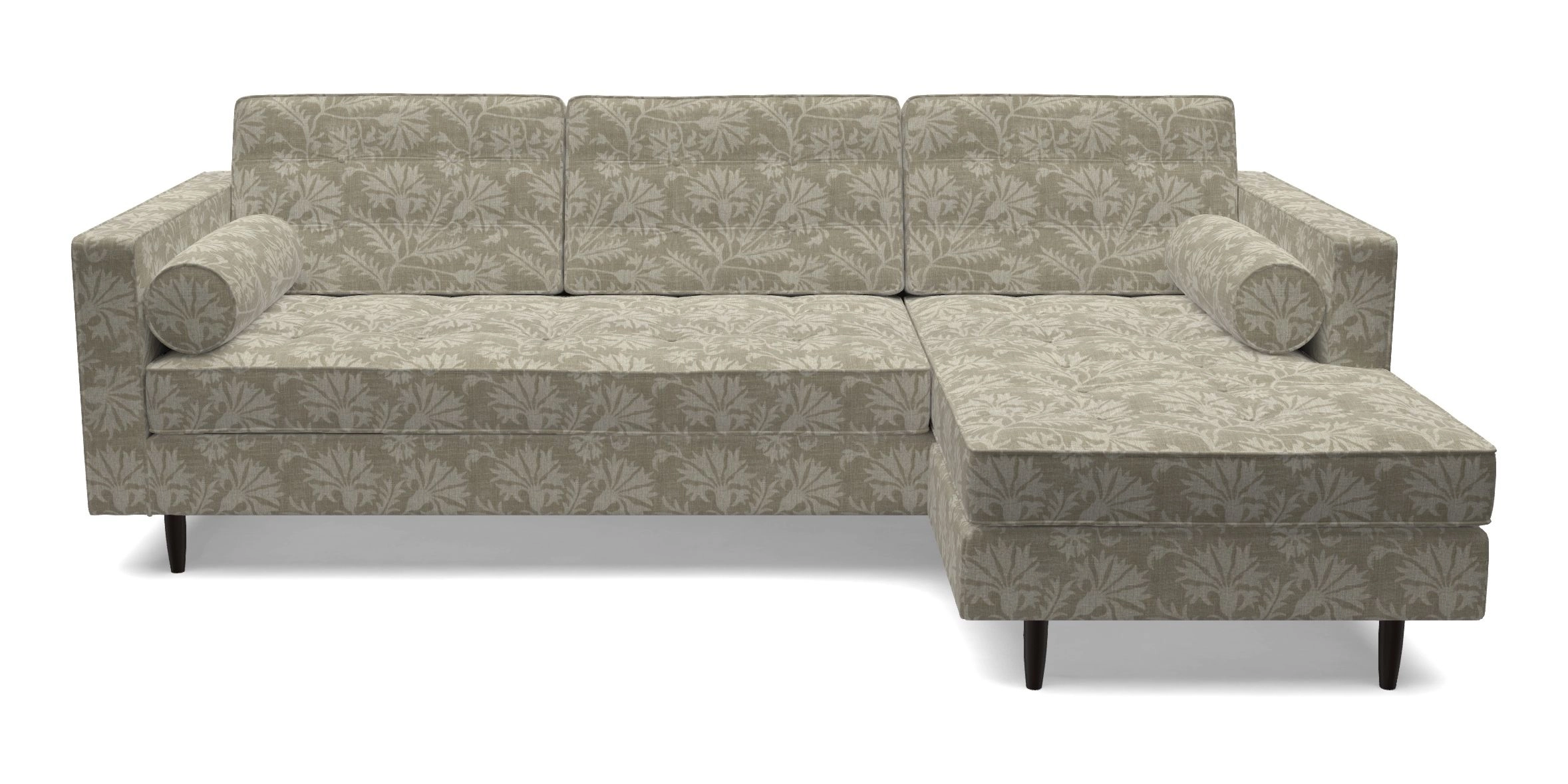 The Marylebone typifies mid-century design with clean square lines, buttoning, and low square arms. Its angular silhouette is complemented by a deep comfy seat and round bolster cushions, offering a chic yet comfortable seating option.