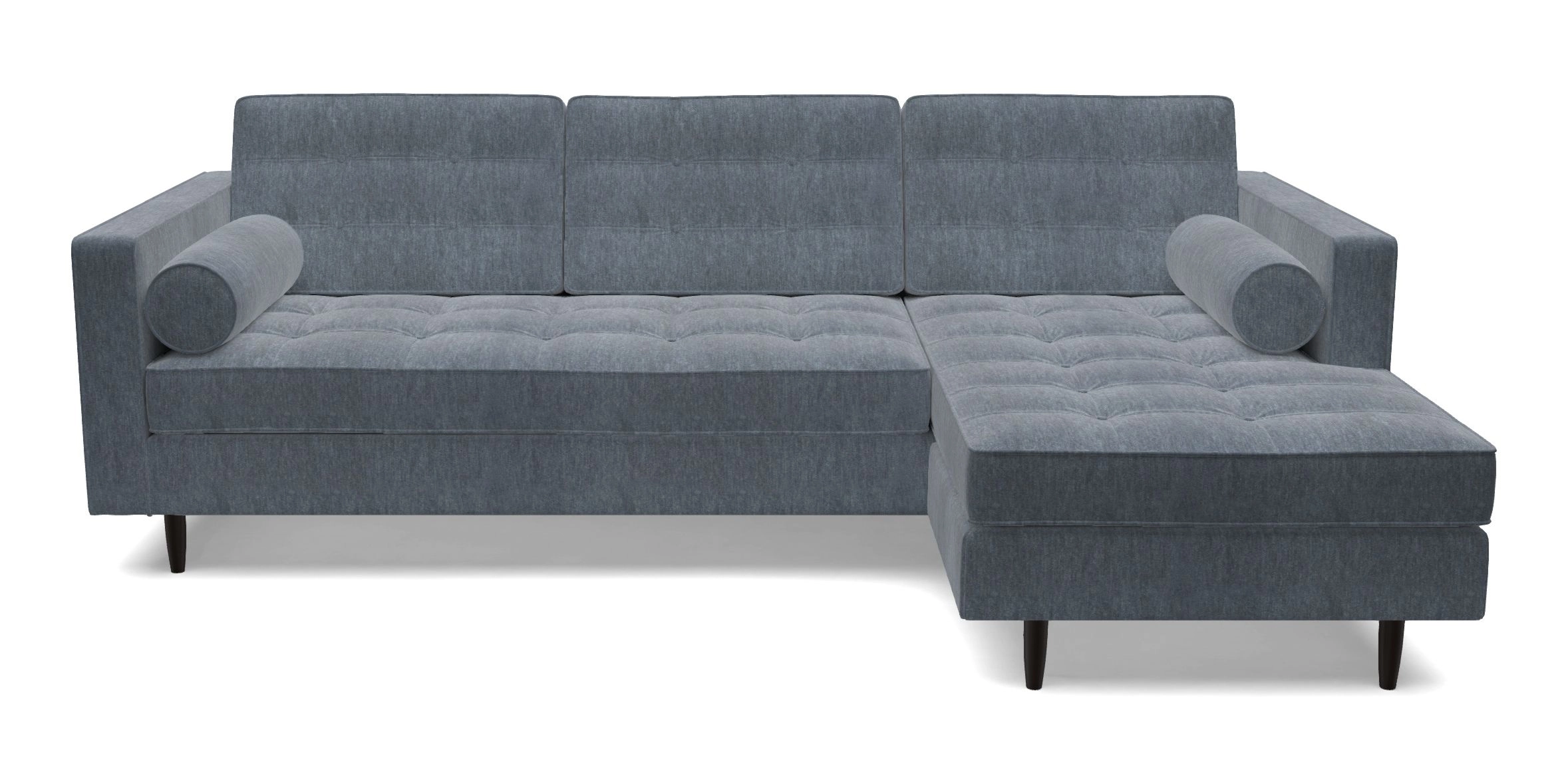 The Marylebone typifies mid-century design with clean square lines, buttoning, and low square arms. Its angular silhouette is complemented by a deep comfy seat and round bolster cushions, offering a chic yet comfortable seating option.