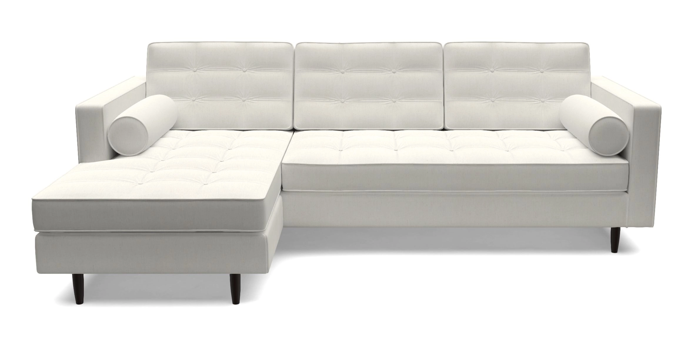 The Marylebone typifies mid-century design with clean square lines, buttoning, and low square arms. Its angular silhouette is complemented by a deep comfy seat and round bolster cushions, offering a chic yet comfortable seating option.