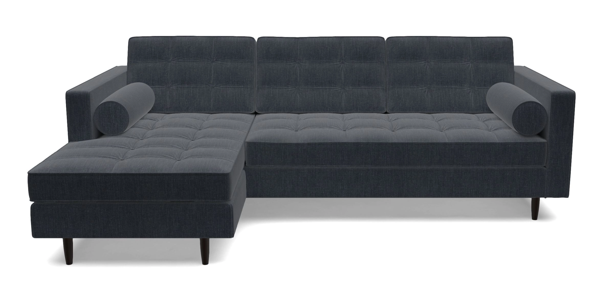 The Marylebone typifies mid-century design with clean square lines, buttoning, and low square arms. Its angular silhouette is complemented by a deep comfy seat and round bolster cushions, offering a chic yet comfortable seating option.