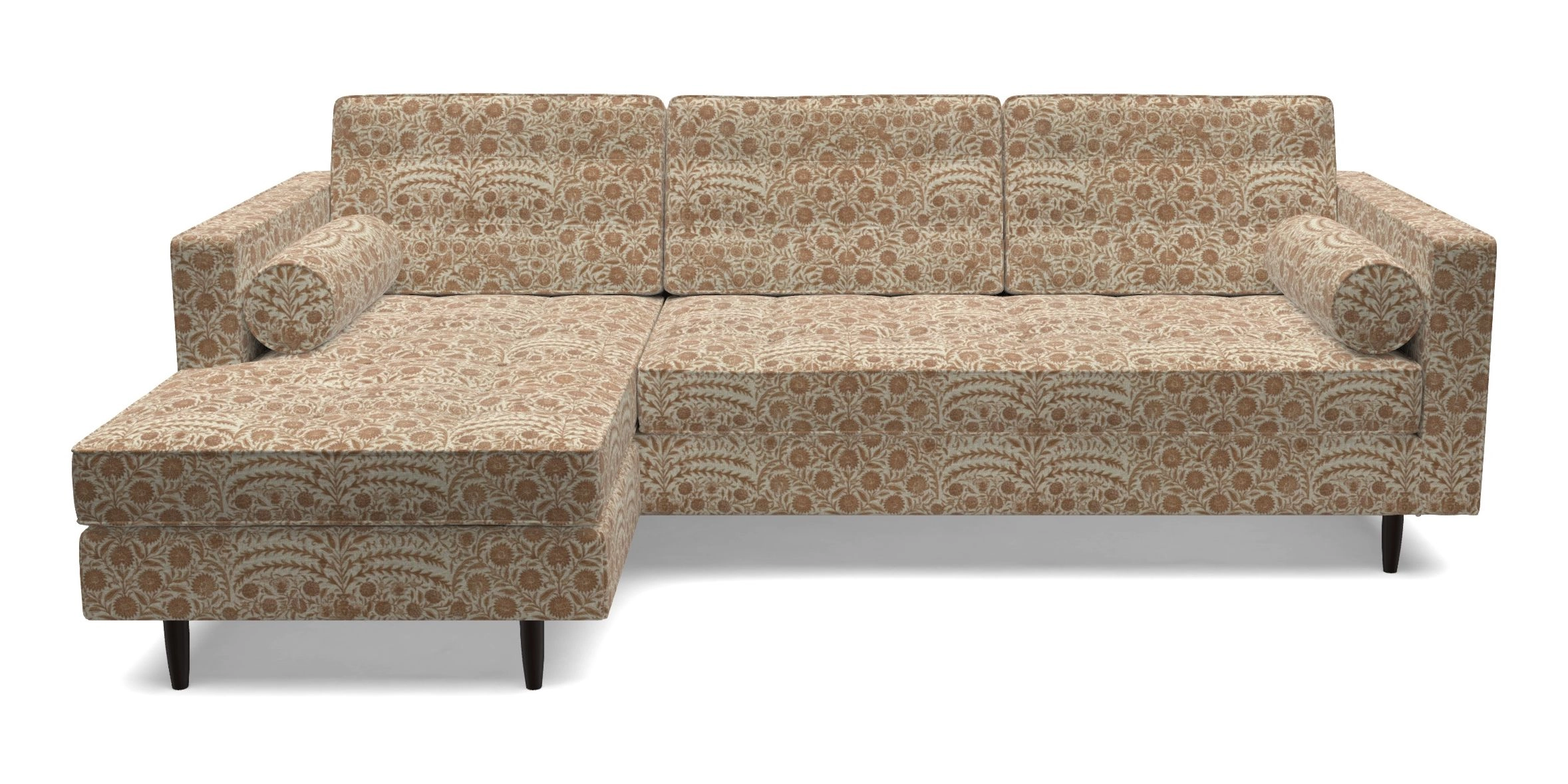The Marylebone typifies mid-century design with clean square lines, buttoning, and low square arms. Its angular silhouette is complemented by a deep comfy seat and round bolster cushions, offering a chic yet comfortable seating option.