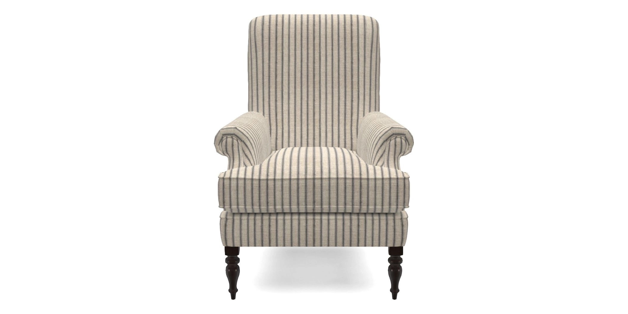 A classic armchair design with a compact profile, featuring a fixed back, and deep, cushioned seat. Its inset scroll arms and self-piped detailing add a touch of refinement, while the firm seat and high back ensure both comfort and support.